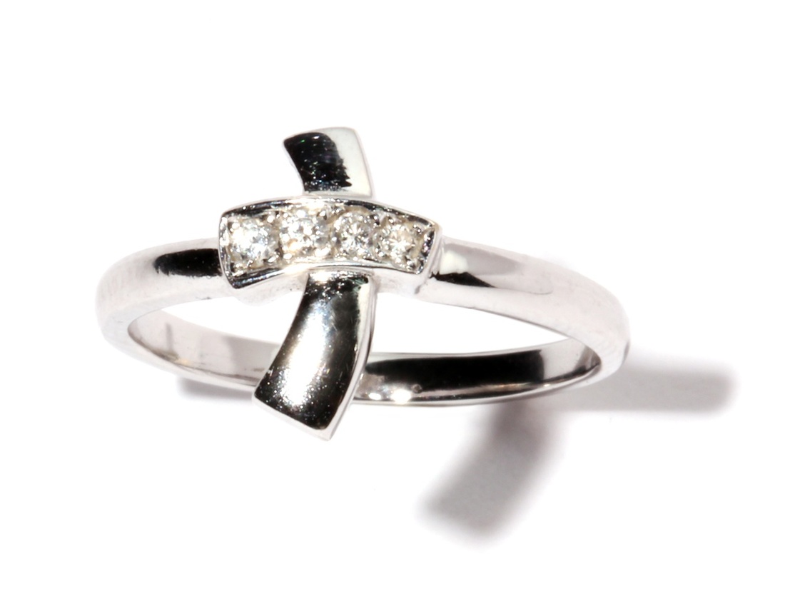 Uniquely shaped 18K white gold diamond ring, inlaid with four small diamonds on top. "18K" engraved on the inside of the ring. Weight: 0.074tl in total