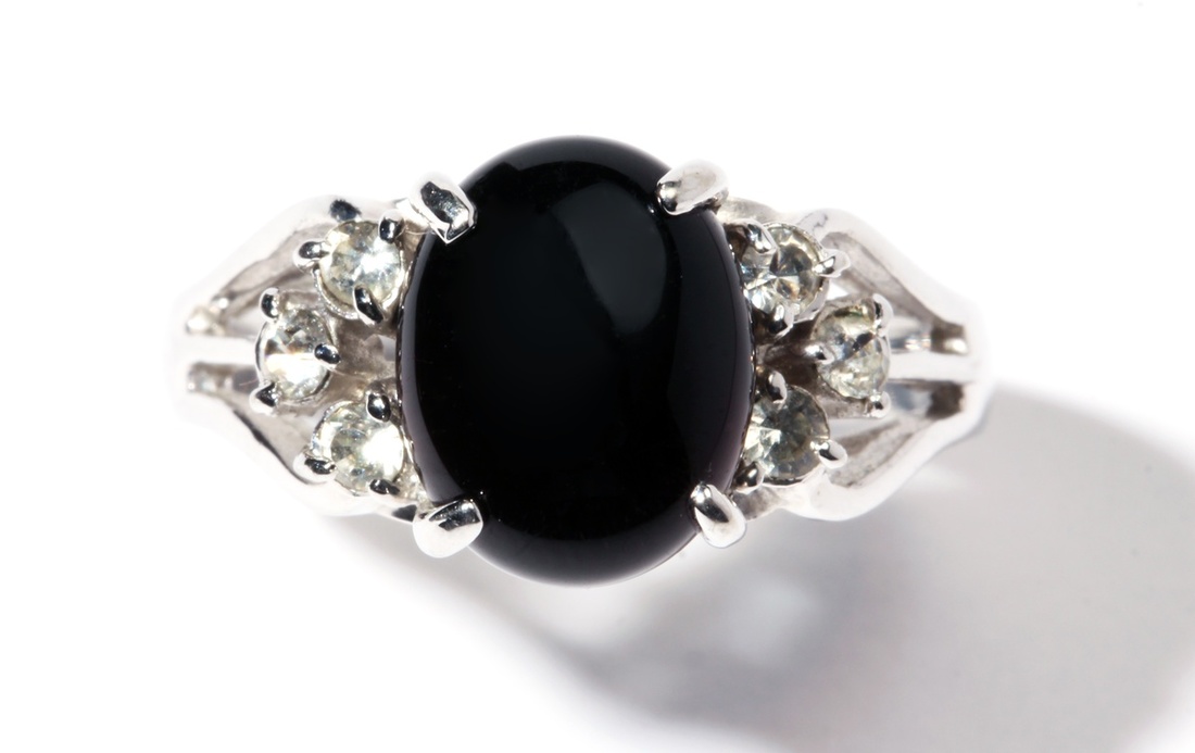 黑瑪瑙925純銀戒指, 黑瑪瑙呈橢圓形, 两旁各鑲嵌了三顆鑽石, 更顯大方得體. 戒指內側上刻 "925" 字樣. 重量: 共0.078tl