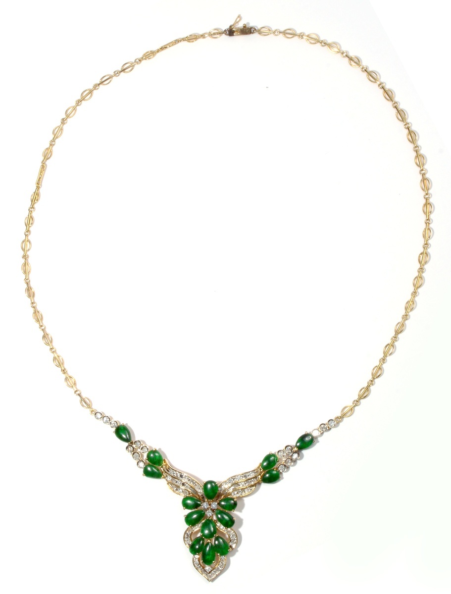 鑲翡翠鑽石14K金項鍊. 鑲小粒翡翠16顆及小粒鑽石63顆. 鑲工精巧, 典雅瑰麗. 鍊扣上刻有"585" 及"任玲記" 字樣. 重量: 共0.434tl