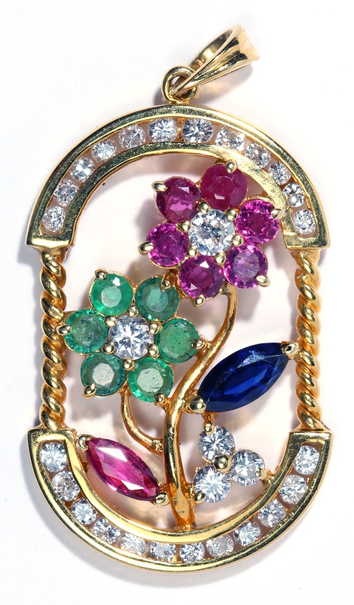鑲寶石14K金吊墜. 吊墜呈橢圓框形設計, 框內鑲嵌三色寶石及鑽石組成之花朵圖形, 光彩閃麗燦然, 可謂獨具意匠, 吊墜吊上刻有"585" 字樣. 重量: 共0.108tl