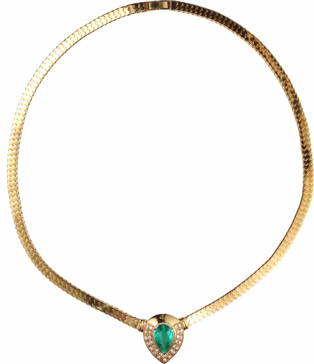 K18/ Pt900金項鍊, 鍊咀部份鑲杏形綠色仿鑽並襯以小鑽石. 而金項鍊為蛇身形設計. 鍊咀上刻有"K18/ Pt900" 字樣. 重量: 共0.842tl