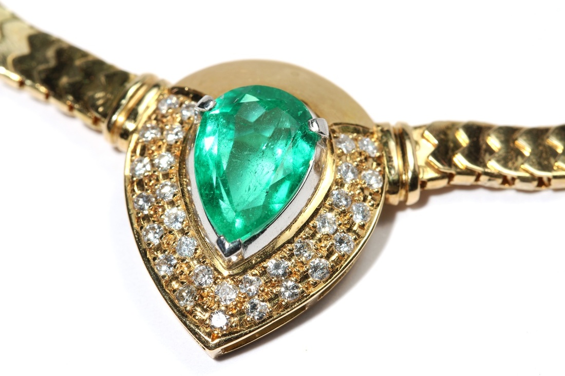 K18/ Pt900 gold necklace, the necklace necklace is set with apricot-shaped green imitation diamonds and around with small diamonds. The gold necklace is designed in the shape of a snake. "K18/ Pt900" is engraved on the necklace pendant. Weight: 0.842tl in total