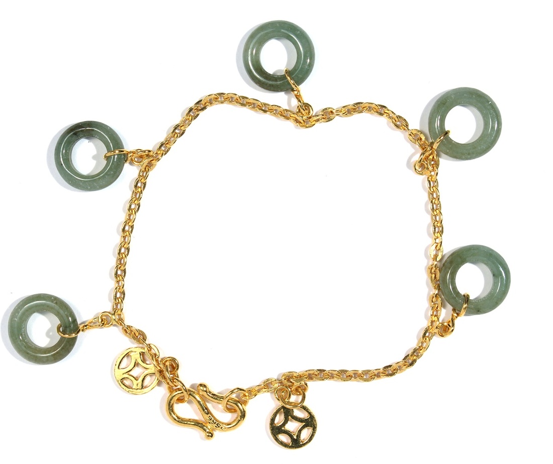 9999 pure gold bracelet with five small jade rings, and decorated with two pure gold in the shape of ancient Chinese coins. The overall design is fun and cute. The word "9999" is engraved on the buckle. Weight: 0.223tl in total