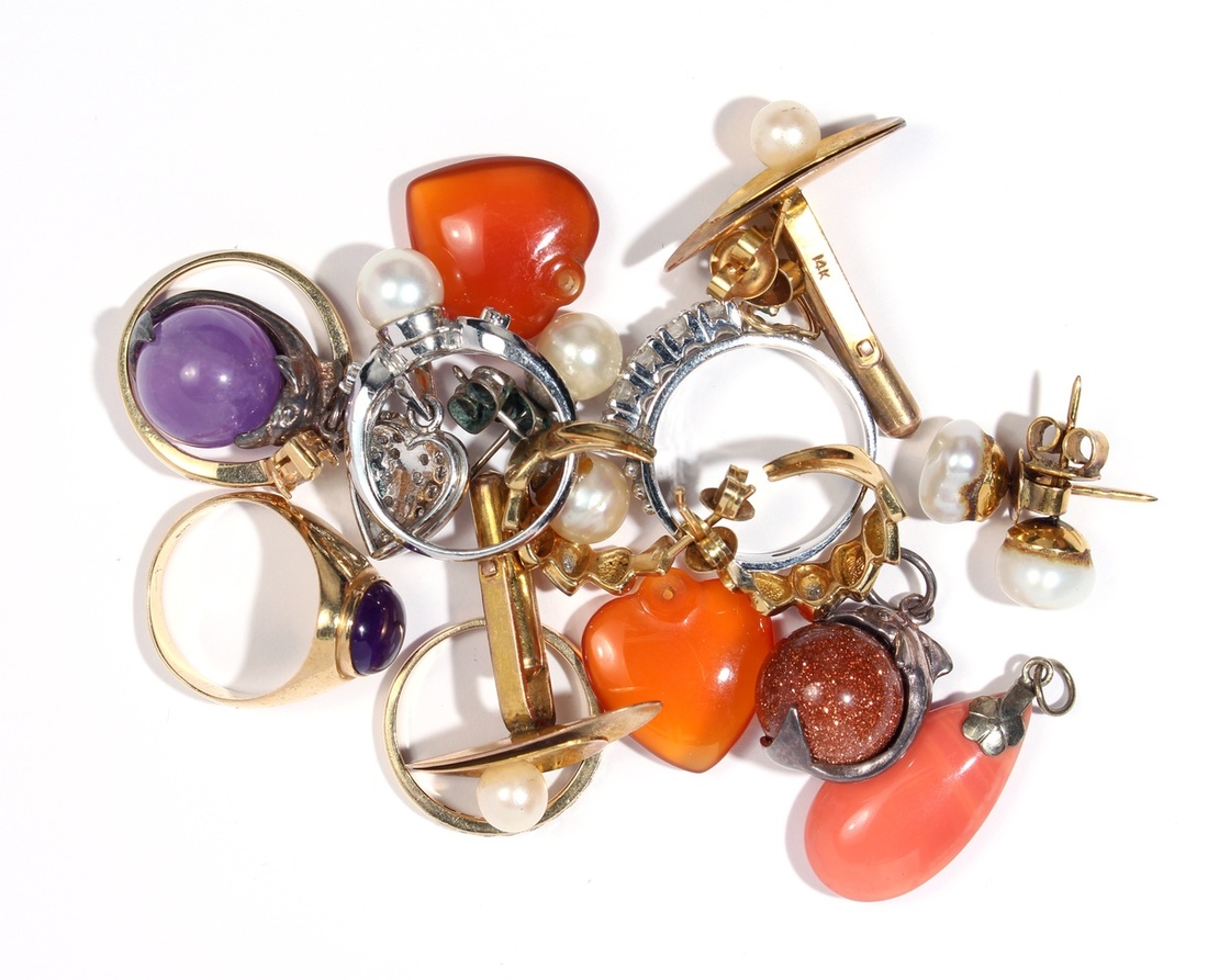 特選各款金銀珍珠首飾共十六項; 包括戒指五枚, 吊墜六件, 耳環四對及袖口扣一對. 品相不一, 敬請預覧.
