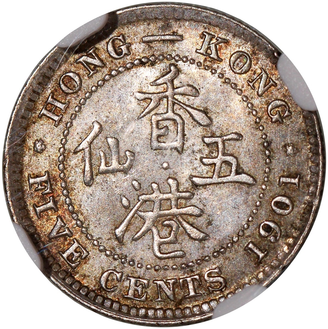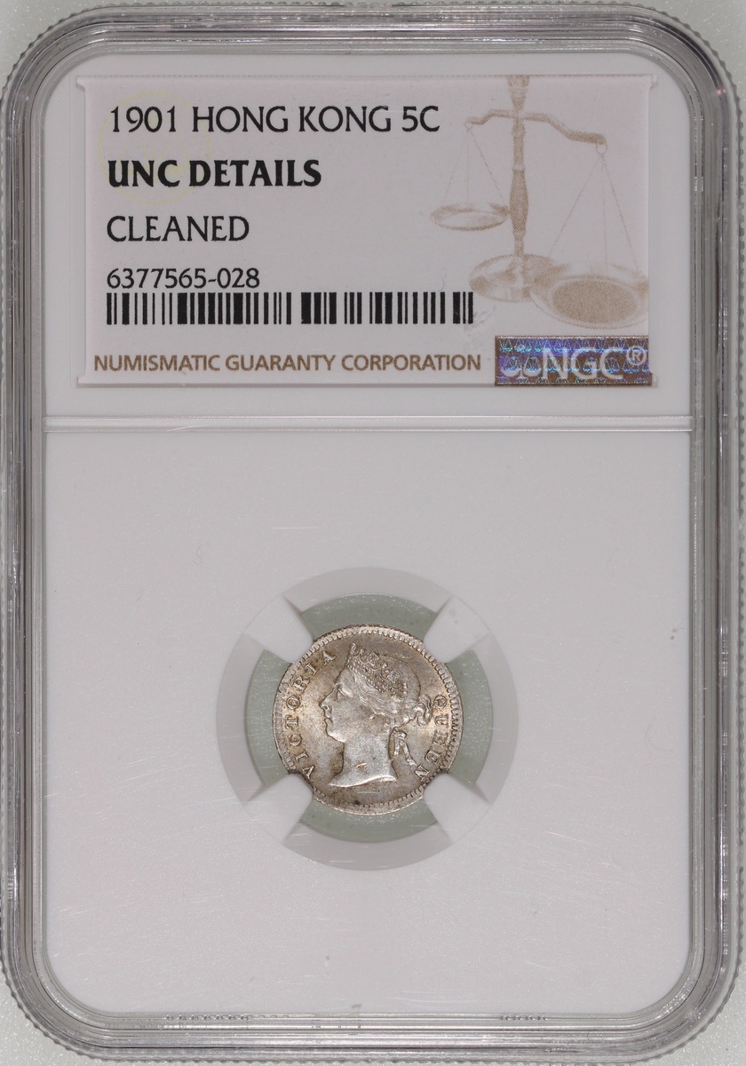 1901年香港維多利亞五仙及1873H香港維多利亞一毫,NGC分別評UNC Details及XF Details,兩枚皆有清洗,#6377565-028及6375934-043