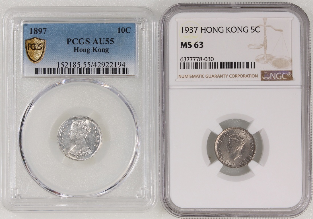 1937年香港喬治六世五仙及1897香港維多利亞一毫,分別評NGC MS63及PCGS AU55,#6377778-030、42922194