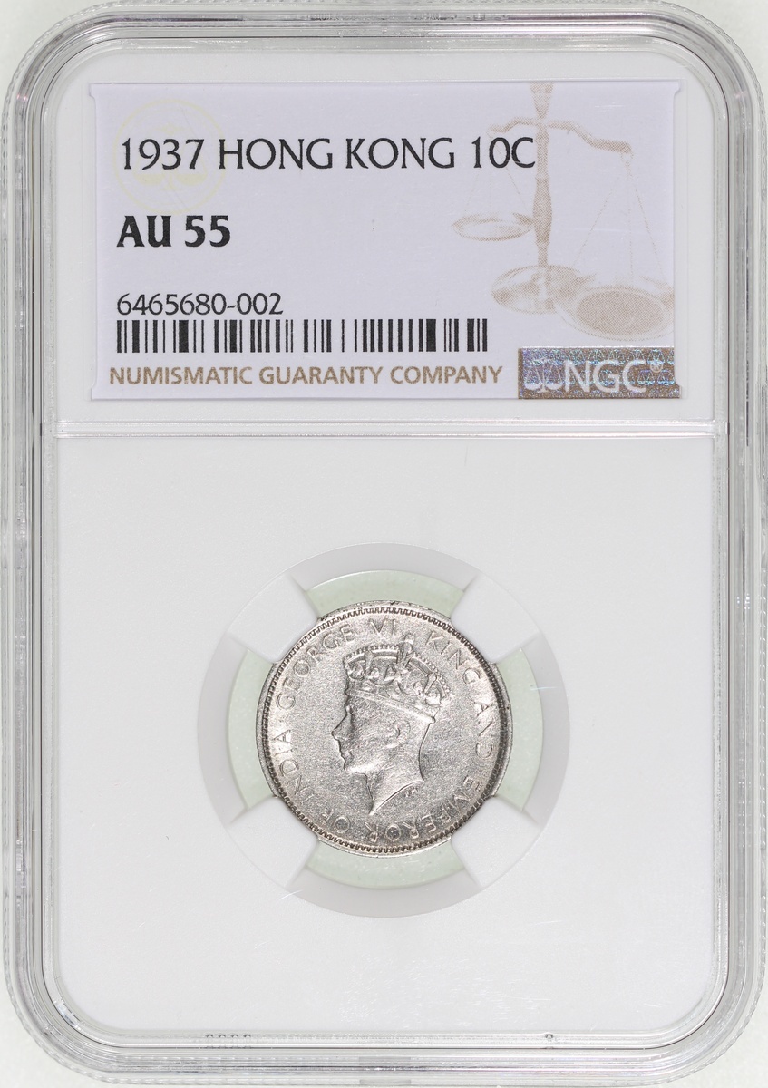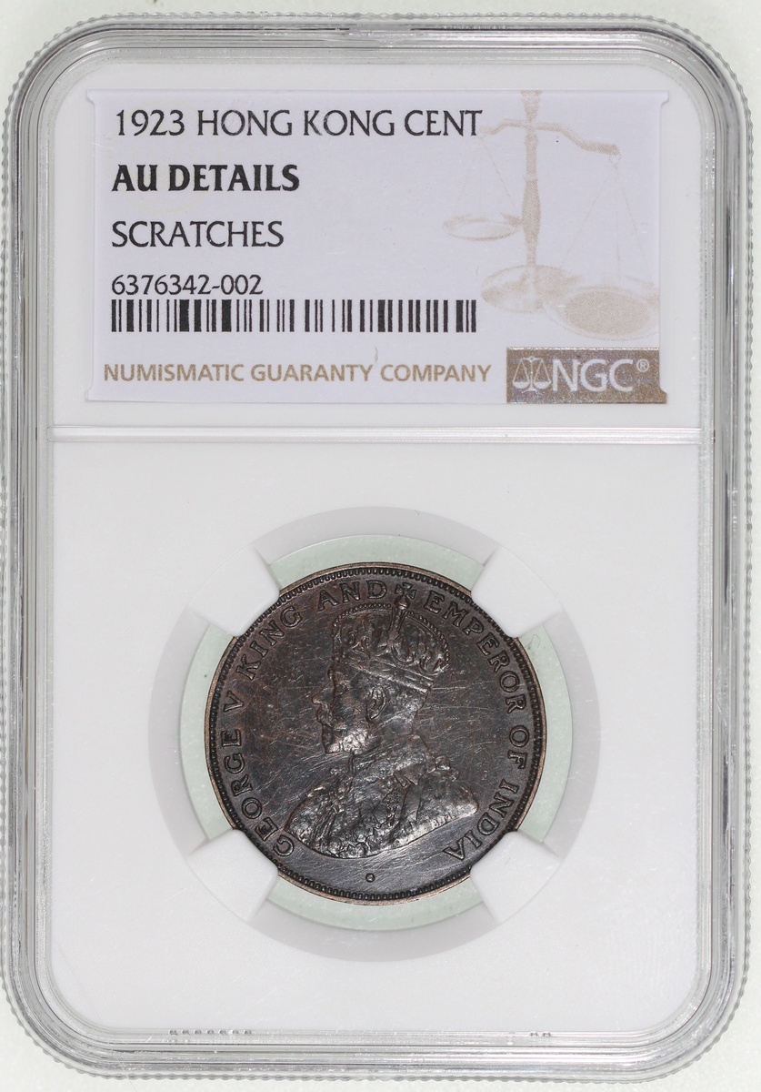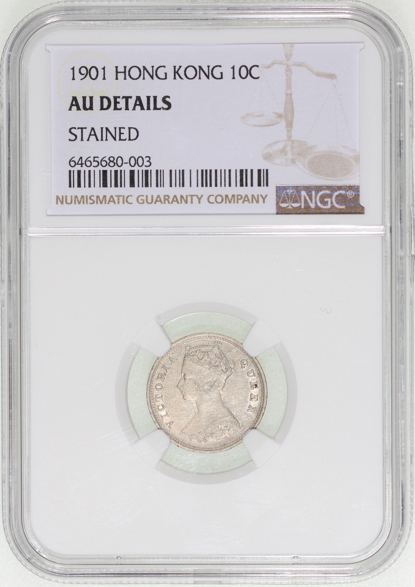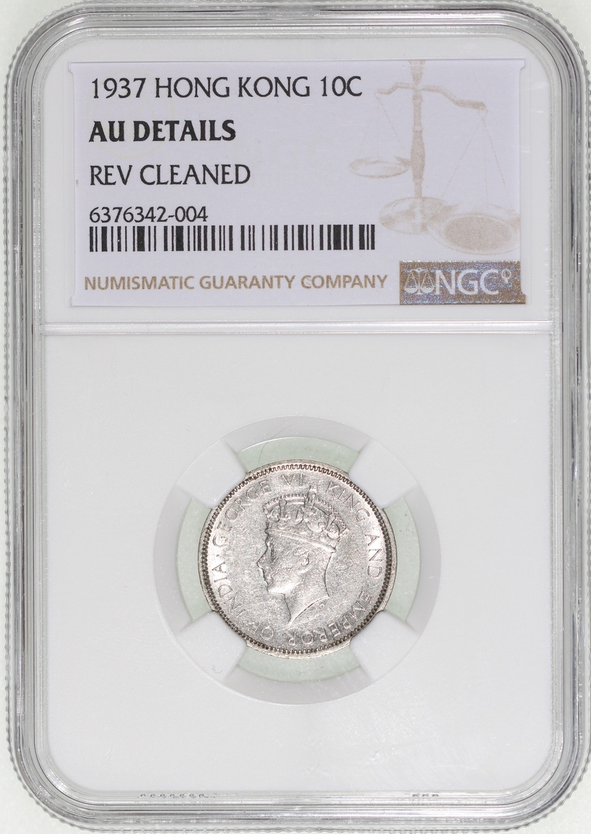 Hong Kong, a group of 4 coins, consists of 1 cent, 1923, 10 cents, 1x 1901 and 2x 1937, graded NGC AU Details (Scratches), AU Details (Stained), AU Details (Reverse Cleaned) and AU55 respectively, #6376342-002, #6465680-003, #6376342-004 and 6465680-002 (4).