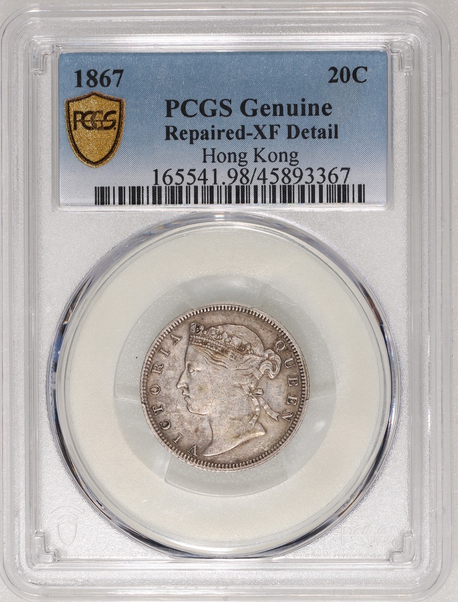 Hong Kong, 20 cents, 1867, PCGS Genuine, repaired, XF Detail. #45893367