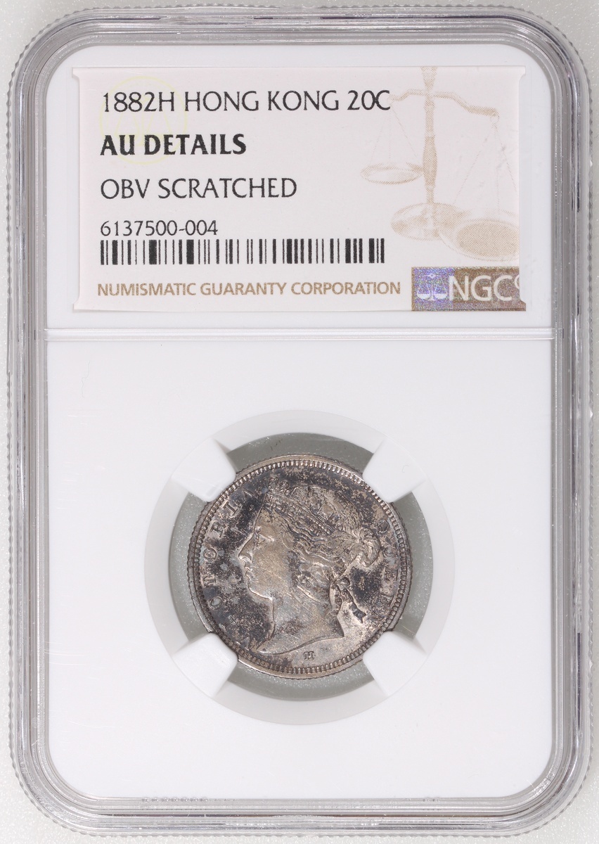 Hong Kong, silver 20 cents, 1882H, NGC AU Details, obverse scratched. Cert.# 6137500-004