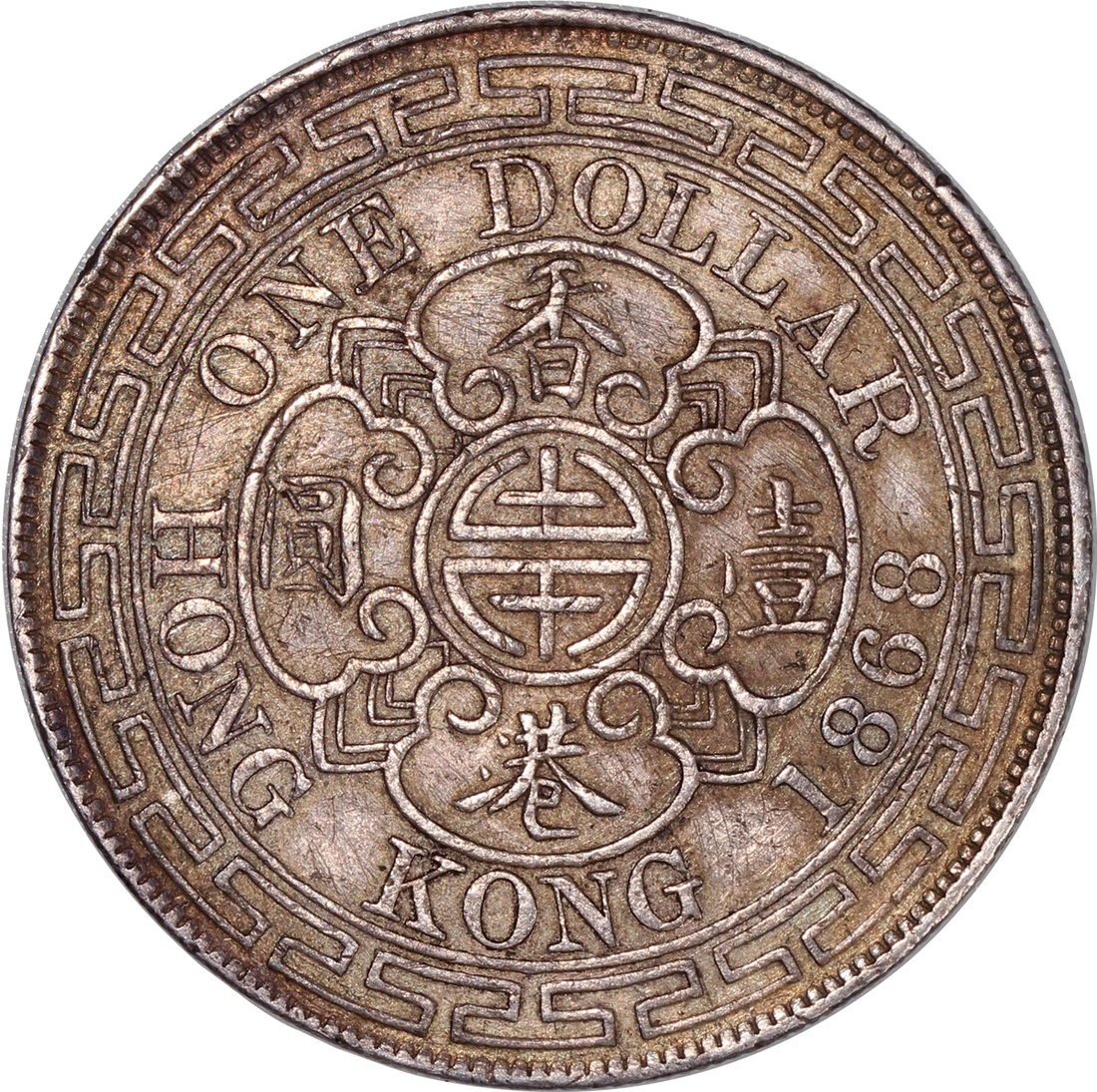 Hong Kong, silver dollar, 1868, about uncirculated, popular type.