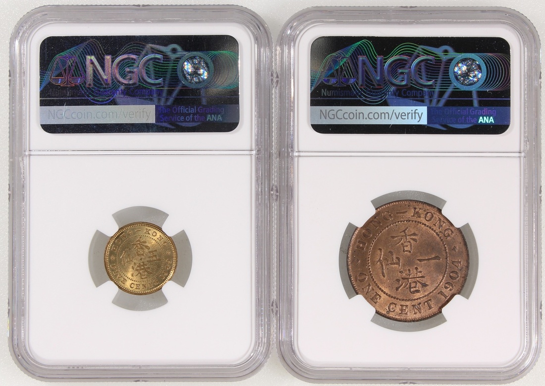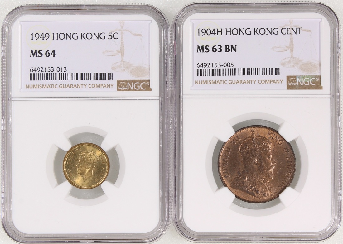 1904H香港愛德華七世一仙及1949年香港喬治六世五仙,NGC分別評MS63BN及MS64,#6492153-005、6492153-013