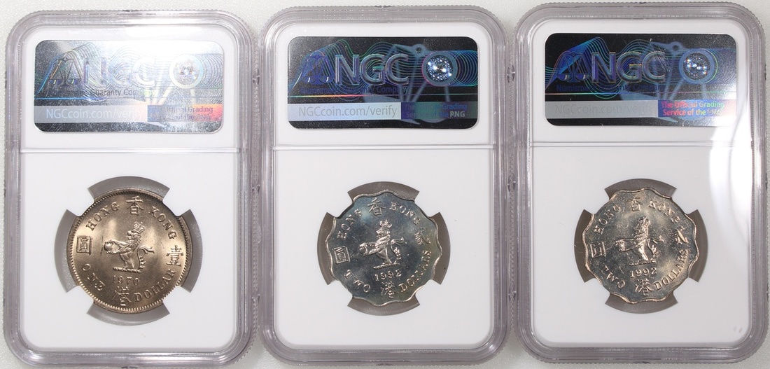 香港伊利沙伯二世錢幣一組三枚,包括:1970H壹圓及1992年貳圓一對,NGC分別評MS63、MS64及MS65,#6377778-011、#6377778-012、#6377778-013