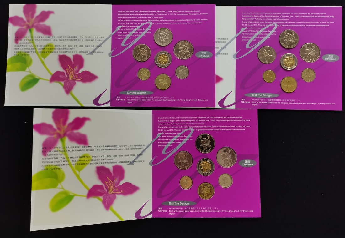 Hong Kong, 3x uncirculated sets, 10 cents to $10, 1997, uncirculated, in original packaging (3 sets, each set with 7 coins)
