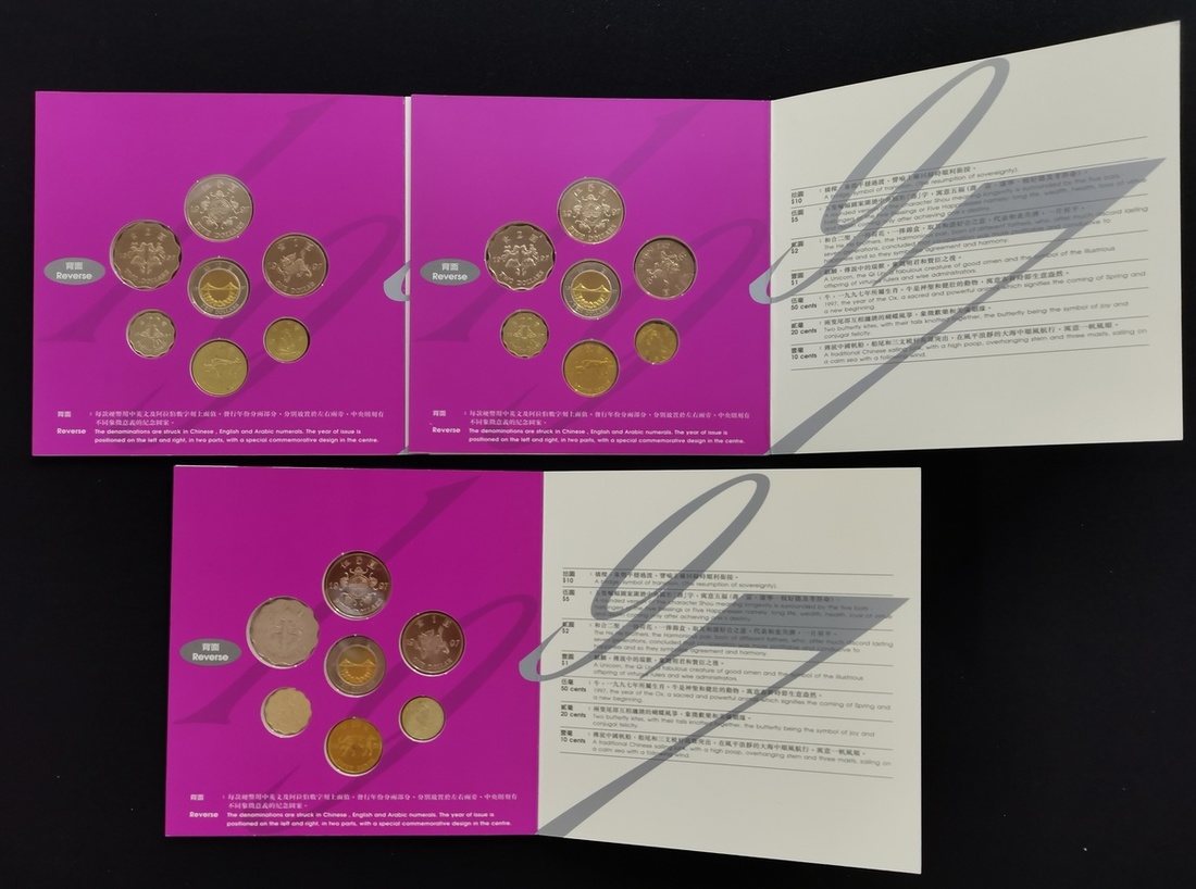 1997年香港未流通套幣3套,各包括1、2、5毫,1、2、5及10元,均UNC附原套