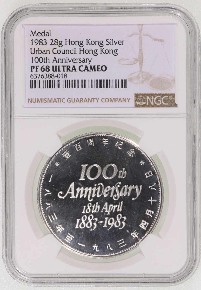 1983年香港市政局一百周年精鑄紀念銀章,NGC PF68 Ultra Cameo,附原盒,稀有,#6376388-018
