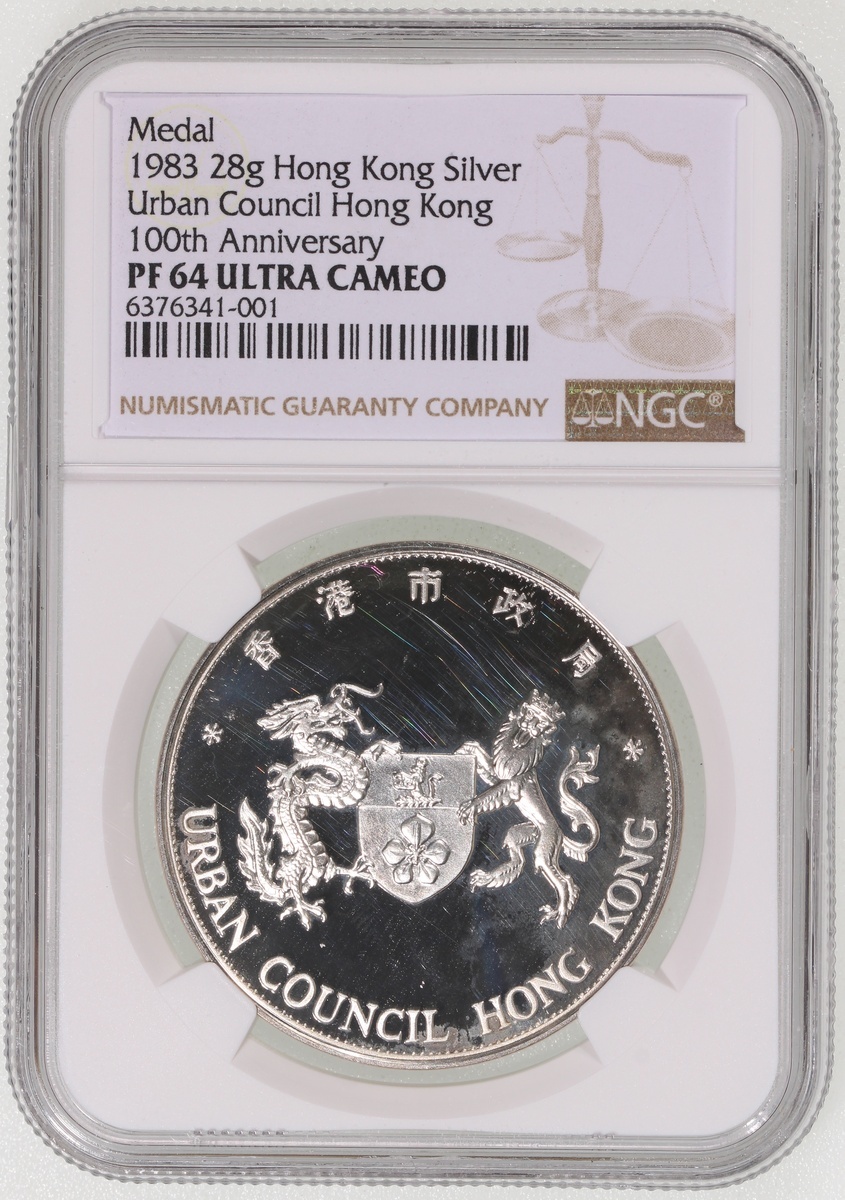 Hong Kong, 100th Anniversary of Urban Council silver medal, PROOF, 1983, weight 28g, NGC PF64 Ultra Cameo, #6376341-001.