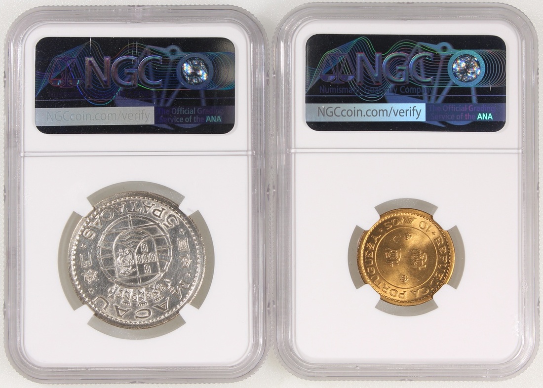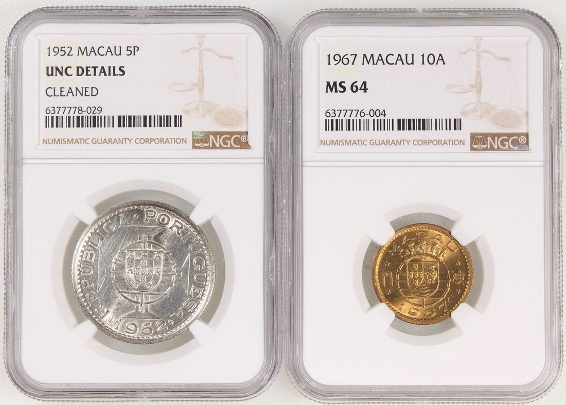 Macau, a pair of 10 avos and 5 patacas, 1967 and 1952, graded NGC MS64 and UNC Details (Cleaned) respectively, with original lustre, #6377776-004 and #6377778-029 (2).