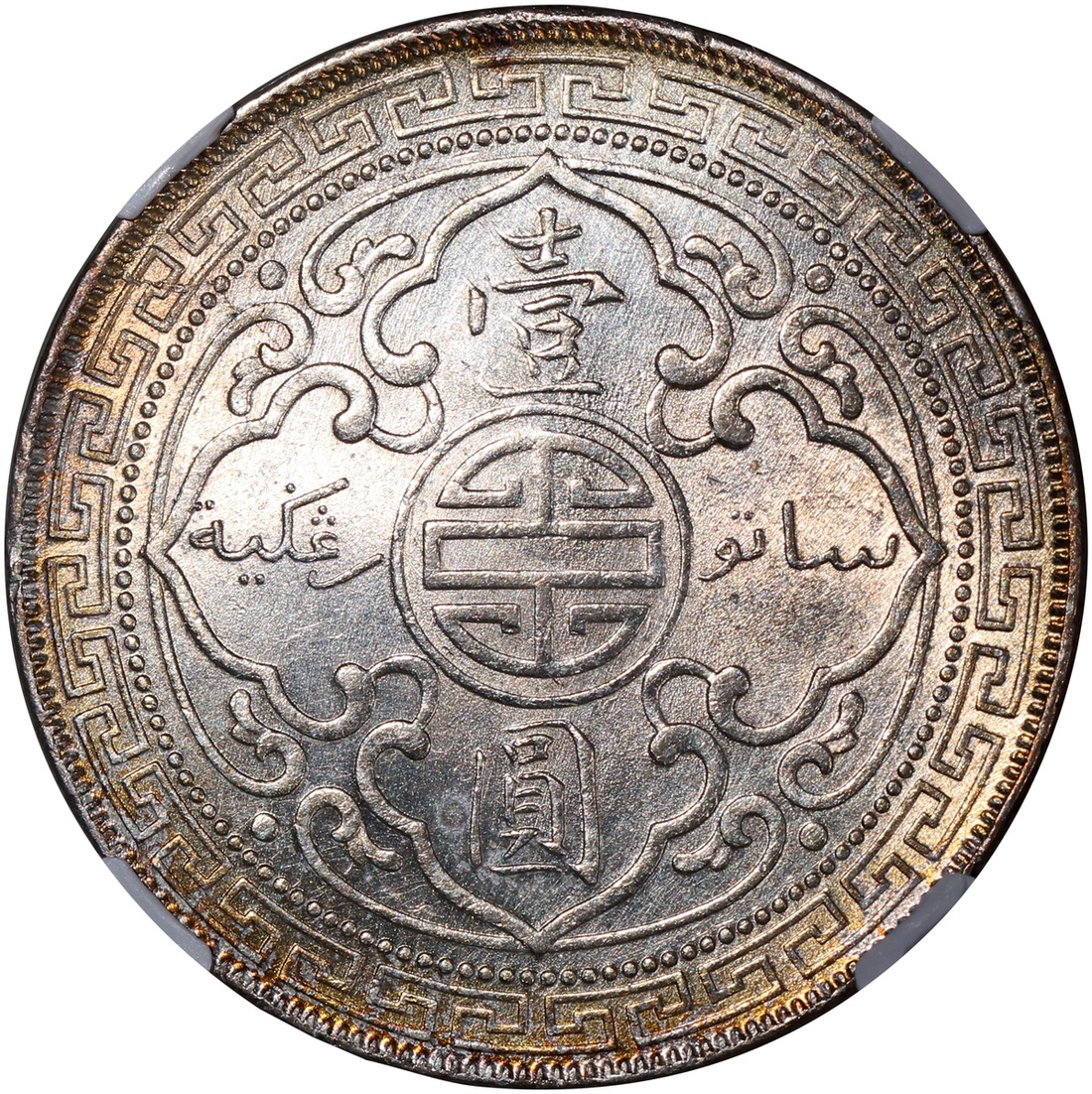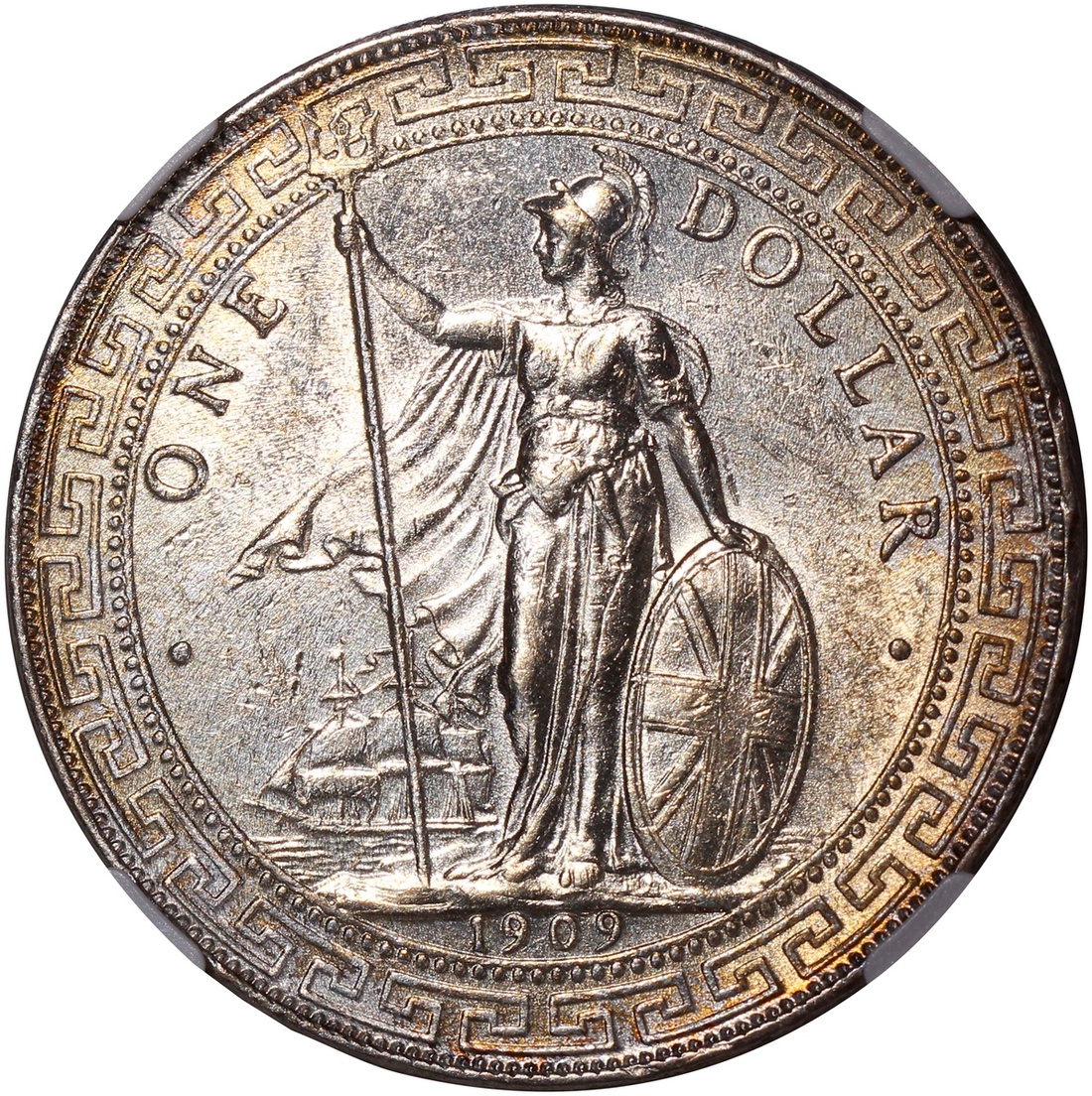 Great Britain, silver trade dollar, 1909-B, NGC UNC Details (Obverse Cleaned), golden toning on both obverse and reverse, #6377778-016.