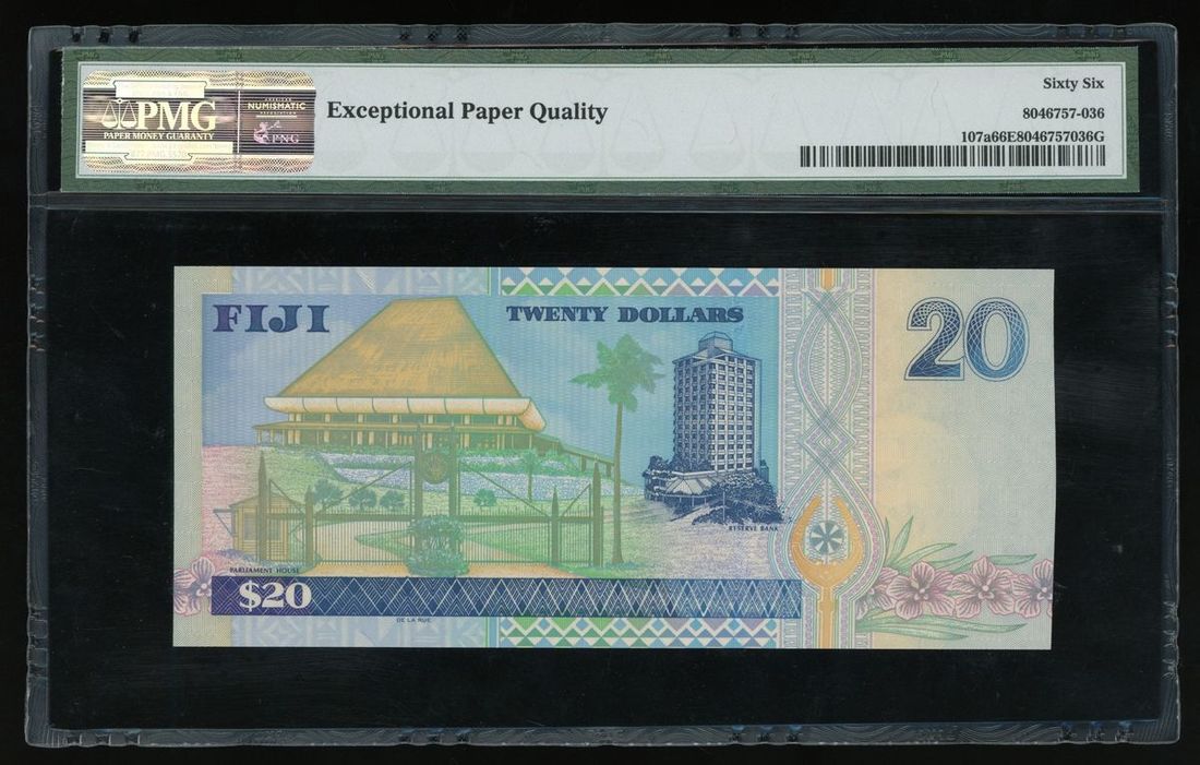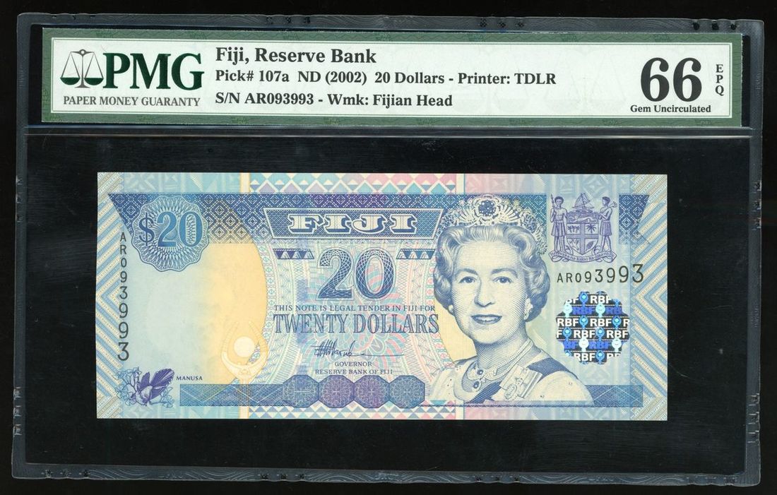 Reserve Bank, Fiji, $20, ND(2002), serial number AR093993, (Pick 107a), PMG 66EPQ Gem Uncirculated.