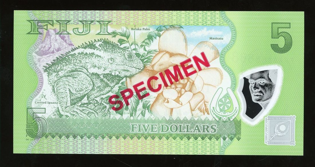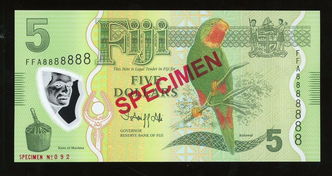 Reserve Bank of Fiji, specimen $5, ND (2013), serial numbers FFA8888888, control number 092, (Pick 115s), note this is the scarcer type with solid 8 serial numbers and control number at lower left, only 100 of these were issued, uncirculated