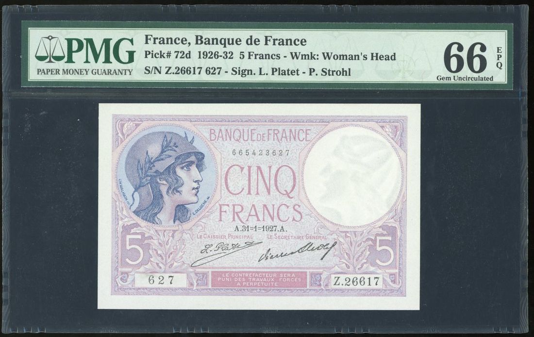 1927年法國5法郎, 編號 Z.26617 627. PMG 66EPQ