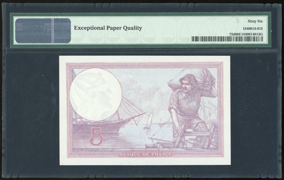 France, Banque de France, 5 francs, 1927, serial number Z.26617 627, (Pick 72d), PMG 66EPQ Gem Uncirculated.