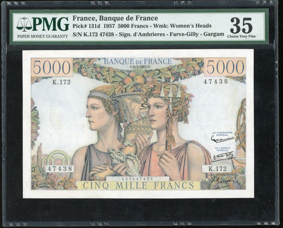 France, Banque de France, a pair of 5000 francs, 1957, serial numbers K.172 47438 and V.165 76795, (Pick 131d), both graded PMG 35 Choice Very Fine, one with minor repairs (2).
