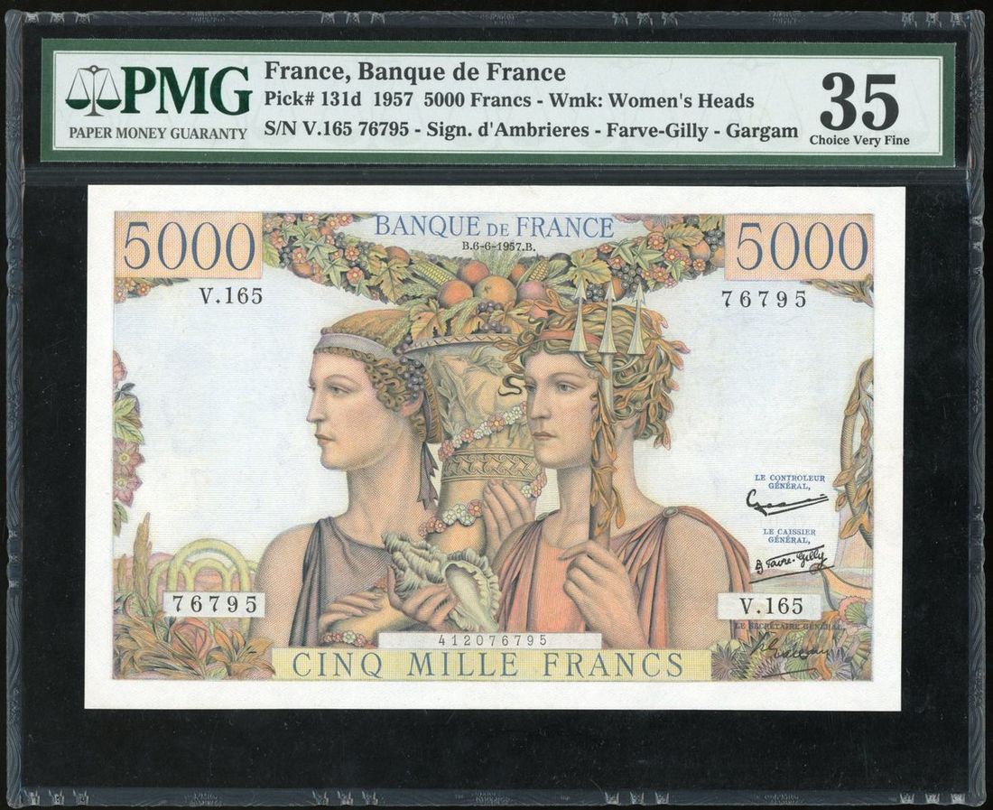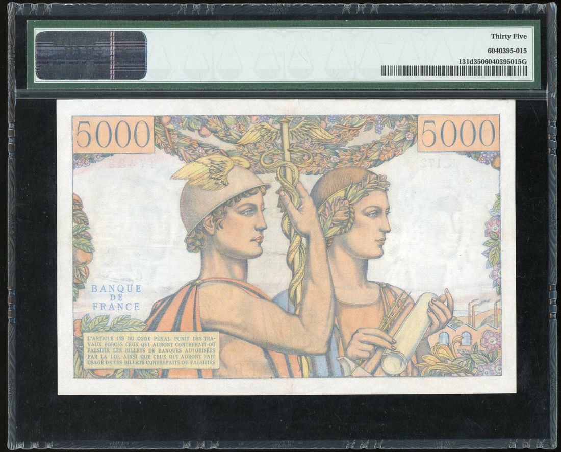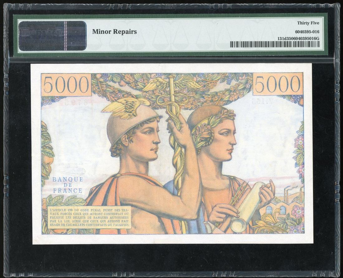1957年法國5000法郎一組兩枚, 編號 K.172 47438及V.165 76795, 均 PMG35 (其一有輕微修補)