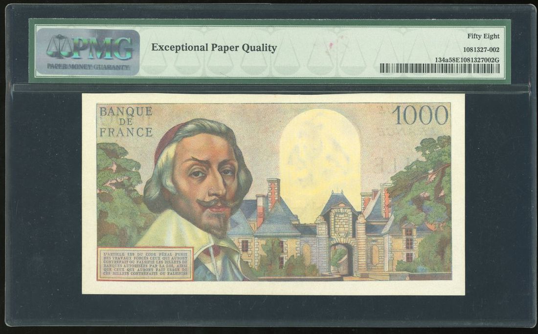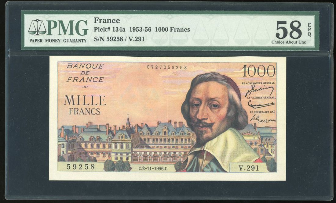 France, Banque de France, 1000 francs, 1956, serial number 59258 / V.291, (Pick 134a), PMG 58EPQ Choice About Uncirculated.