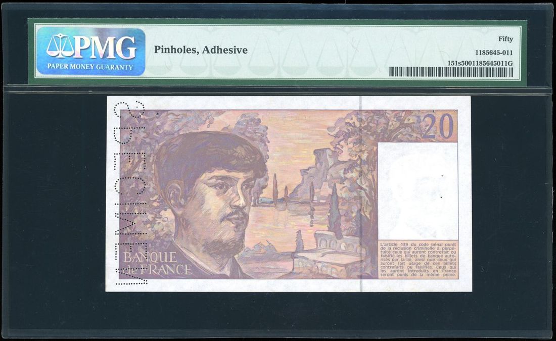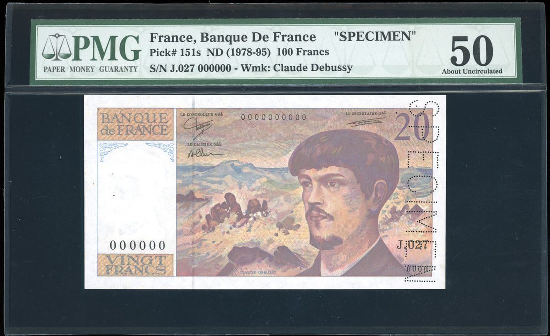 1978-95年法國100法郎樣票, 編號 J.027 000000, PMG 50 (有細孔, 有粘) PMG紀錄僅有九枚