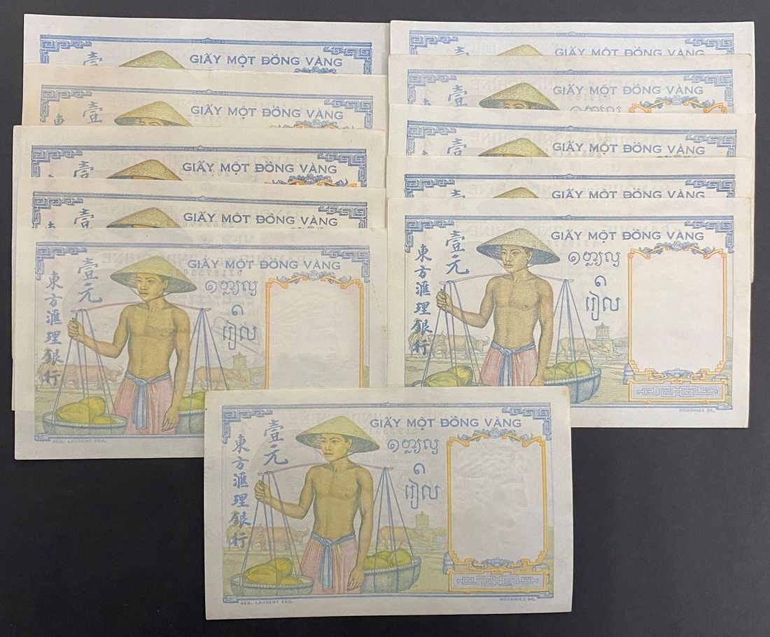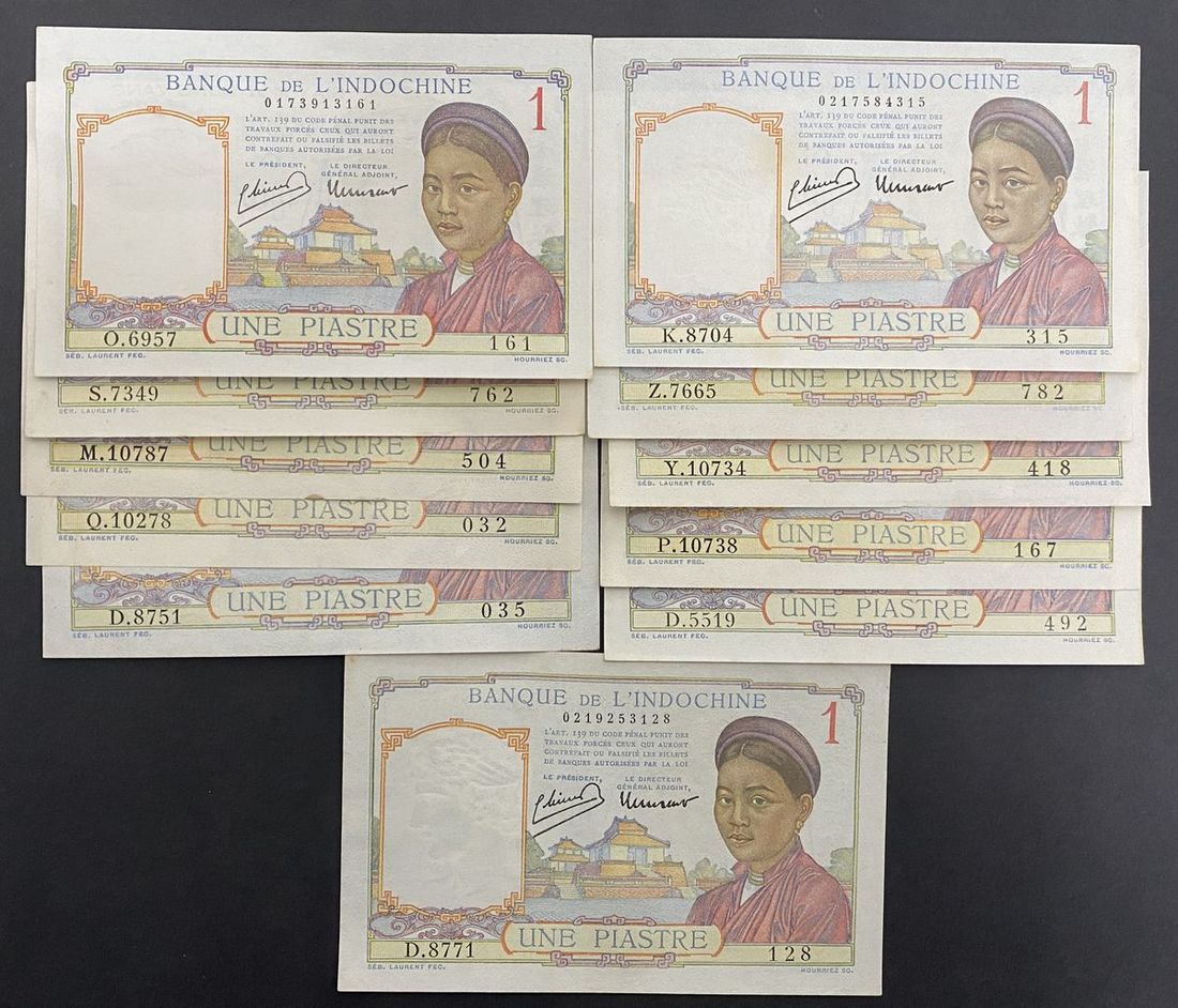 Banque De L'Indochine, a group of 11x 1 piastre, no date (1932), various serial numbers, (Pick 52), about uncirculated to uncirculated, several with mild foxing and stains, viewing recommended (11).