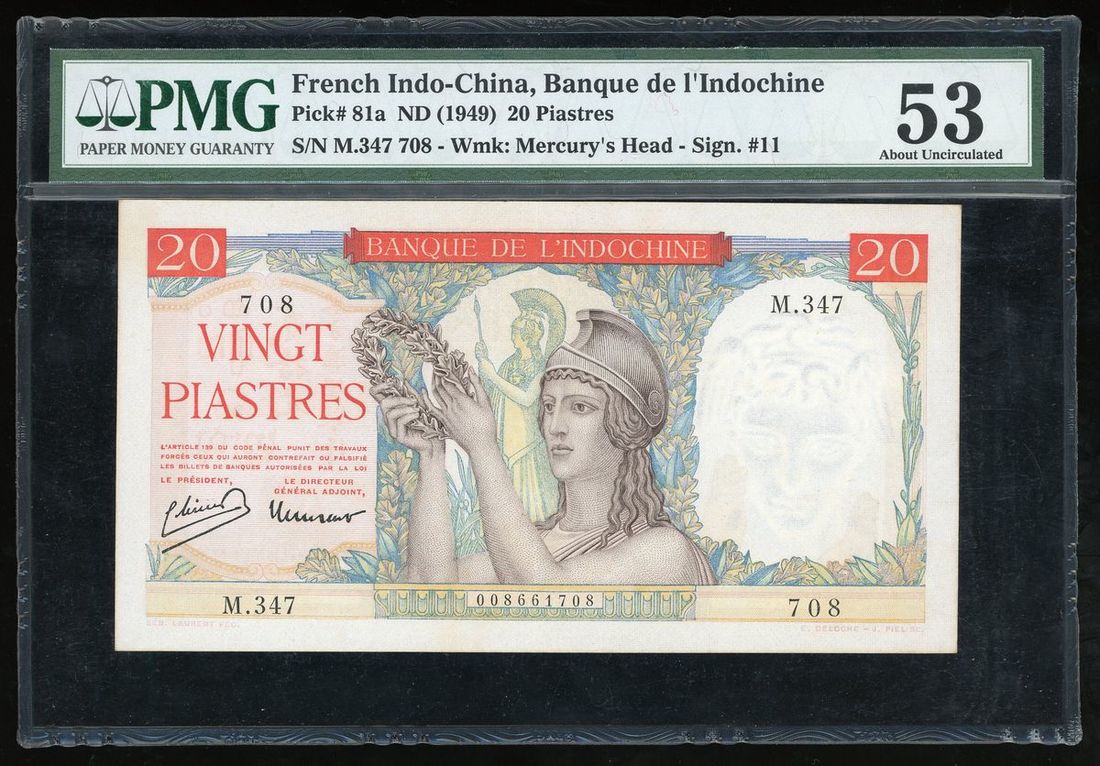 Banque de l'Indochine, French Indo-China, 20 piastres, ND (1949), serial number M.347 708, (Pick 81a), PMG 53 About Uncirculated