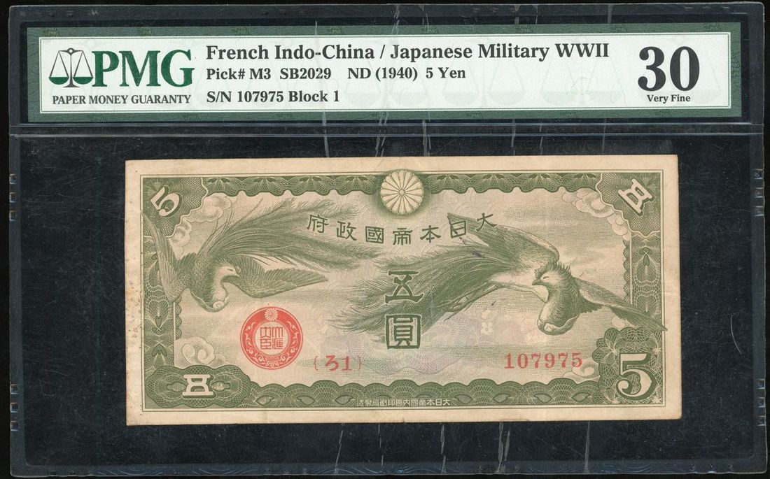 French Indo China, Japanese Military WWII, 5 yen, ND (1940), serial number 107975, block 1, (Pick M3), PMG 30. This series quite scarce