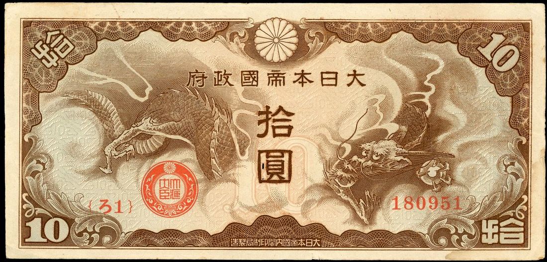 1940年日佔時期法屬安南10圓, 編號 180951, 組號31, EF品相, 有水漬