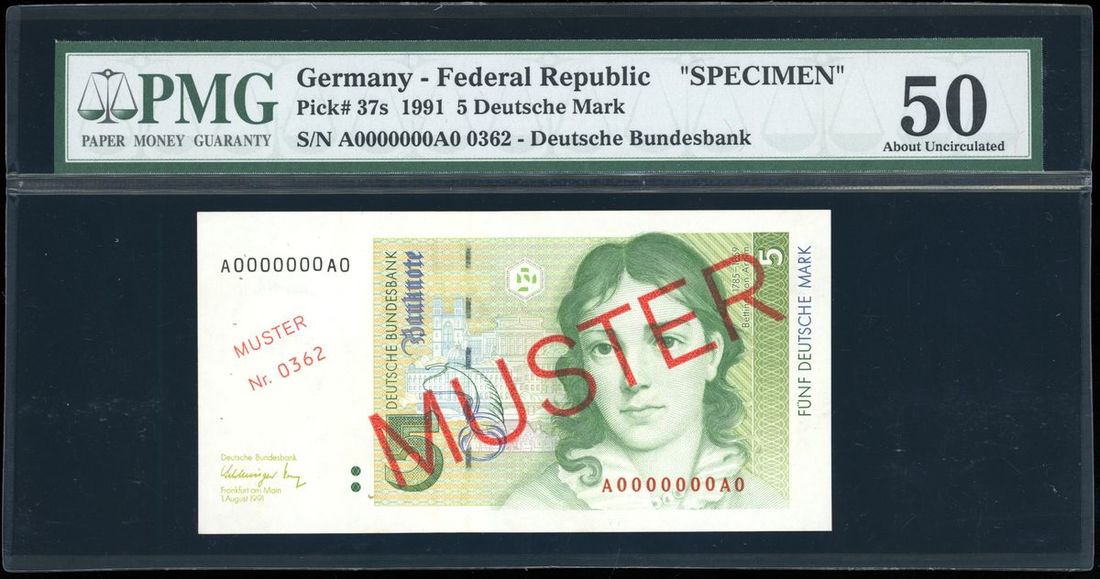 Deutsche Bundesbank, Federal Republic of Germany, specimen 5 deutsche mark, 1991, serial number A0000000A0, (Pick 37s), PMG 50 About Uncirculated (Pinholes), only a total of 5 on record in the PMG population report