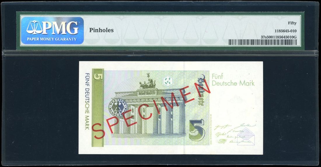 1991年德國5馬克樣票, 編號 A0000000A0. PMG 50, 有細孔. PMG紀錄中僅5枚