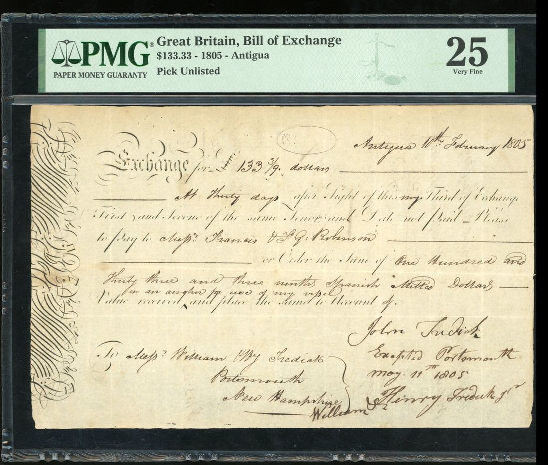 Great Britain, bill of exchange of $133.33, Antigua, 1805, (Pick unlisted), PMG 25 Very Fine (Pinholes).