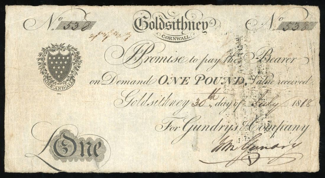 Great Britain, Goldsithney Bank, £1, 1818, serial number 538, (Pick unlisted), fine or so, well preserved, rare to have such good condition for a note having more than 200 years history.