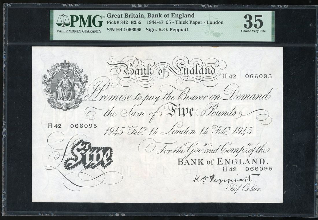Bank of England, Great Britain, £5, 1945, London, serial number H42 066095, thick paper, signed by K.O. Peppiatt,