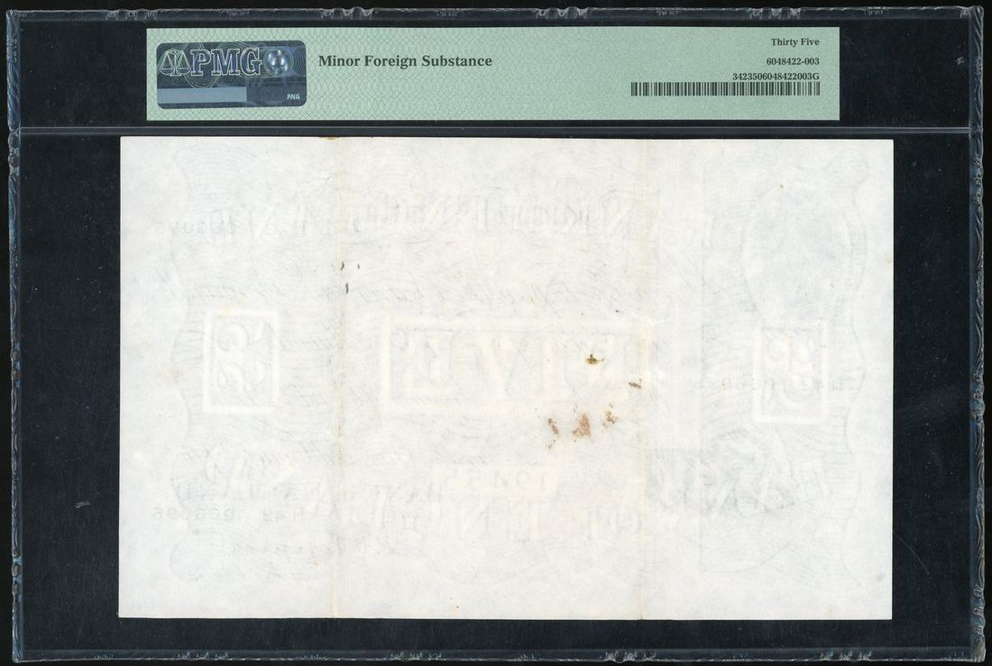 1945年英倫銀行5鎊, 編號 H42 066095, PMG 35, 有附著物