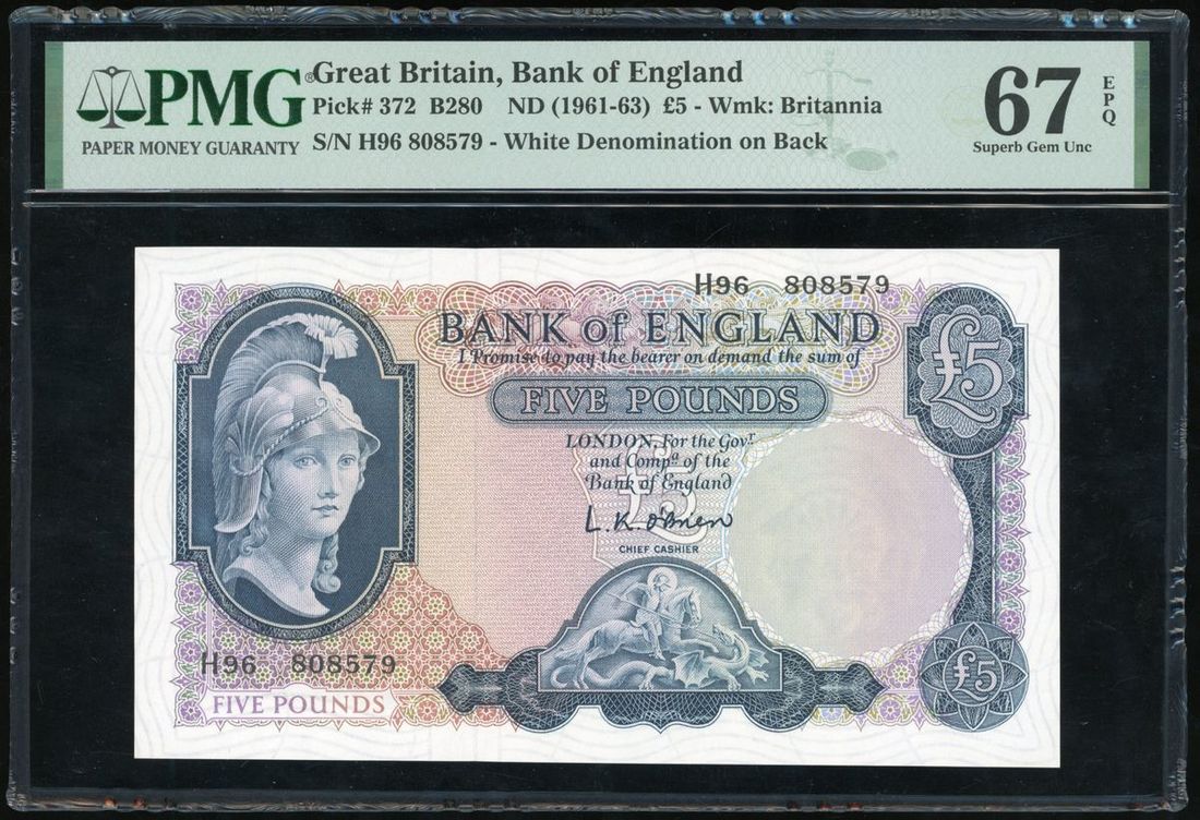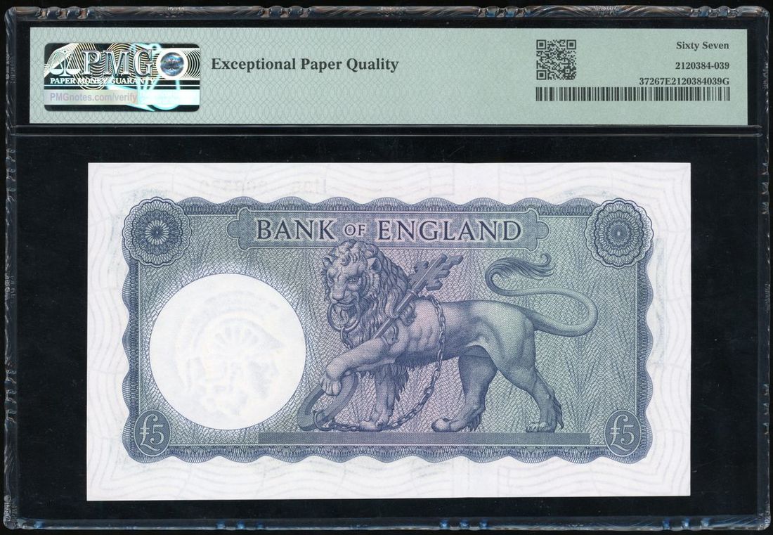 1961-63年英倫銀行5鎊, 編號 H96 8085799, PMG 67EPQ