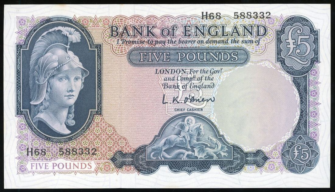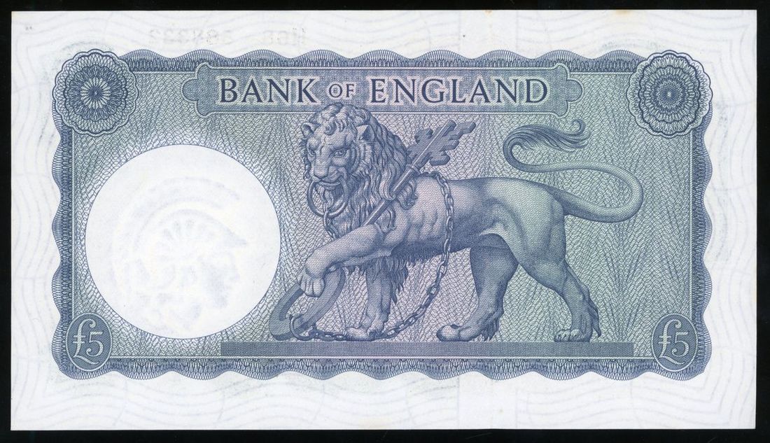 Bank of England, Great Britain, £5, ND (1961-1963), serial number H59 588332, white denimination on back,