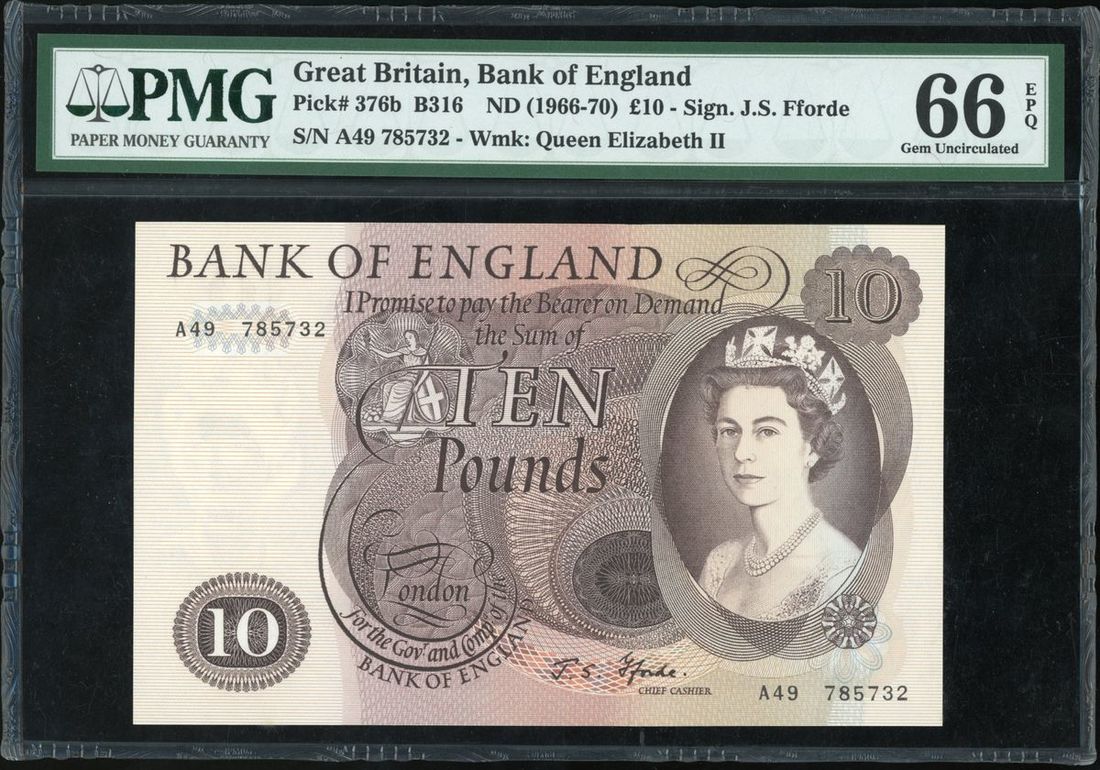 1966-70年英倫銀行10鎊, 編號A49 785732, PMG 66EPQ