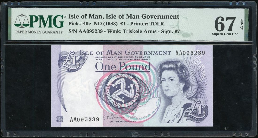 Isle of Man Government, £1, ND (1983), serial number AA095239, (Pick 40c), PMG 67EPQ Superb Gem Uncirculated.