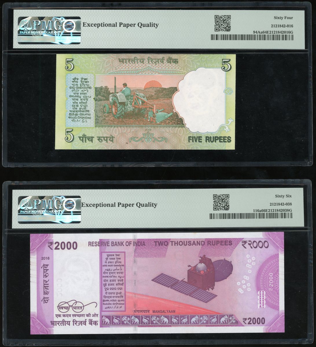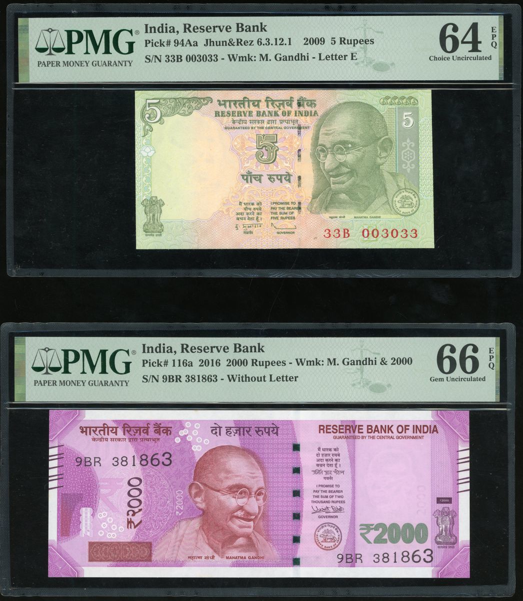 Reserve Bank of India, a pair of 5 and 2000 rupees, 2009 and 2016, serial numbers 33B 003033 and 9BR 381863, 2000 rupees only issued in 2016-17, thus scare,