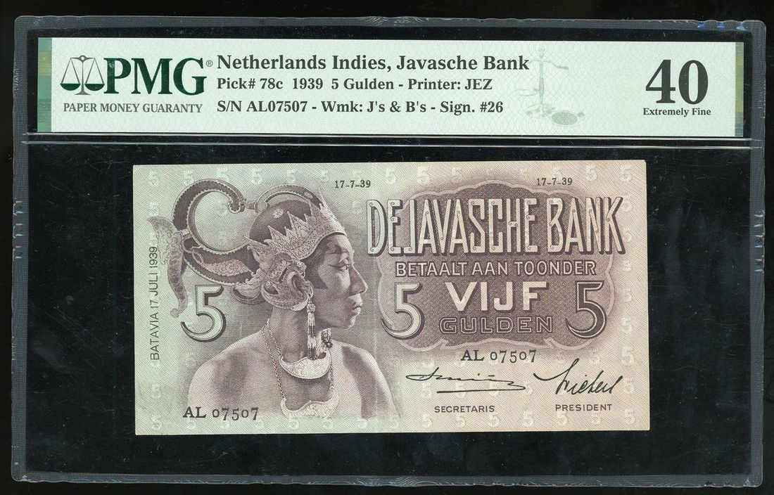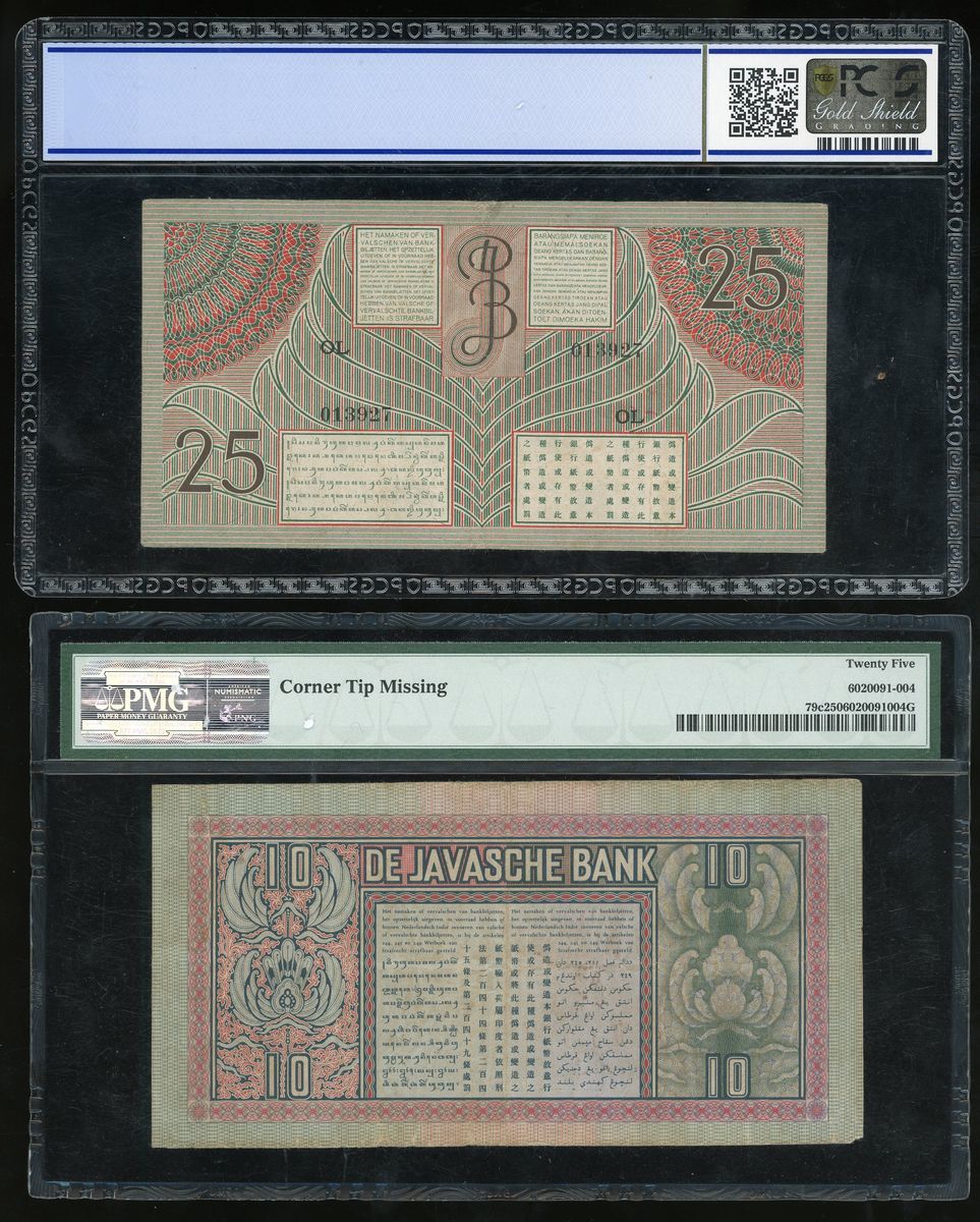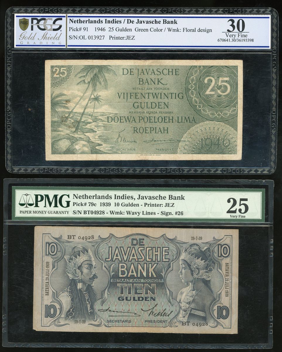 荷屬東印度一組三枚, 包括 1939年5及10盾, 1946年25盾, PMG 40, 25 (紙角有缺), PCGS 30