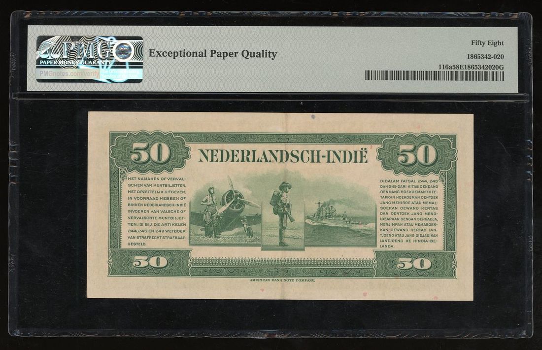 Netherlands Indies, Muntbiljet, 50 gulden, 1943, serial number GZ016915A, (Pick 116a), PMG 58EPQ Choice About Uncirculated
