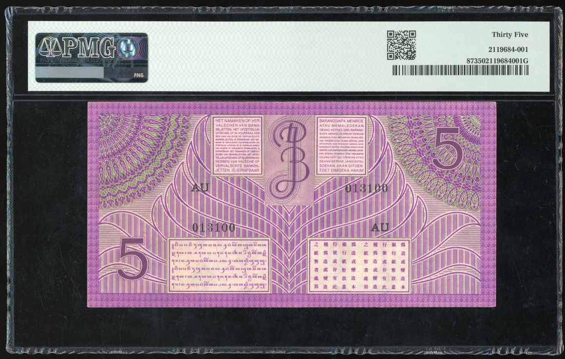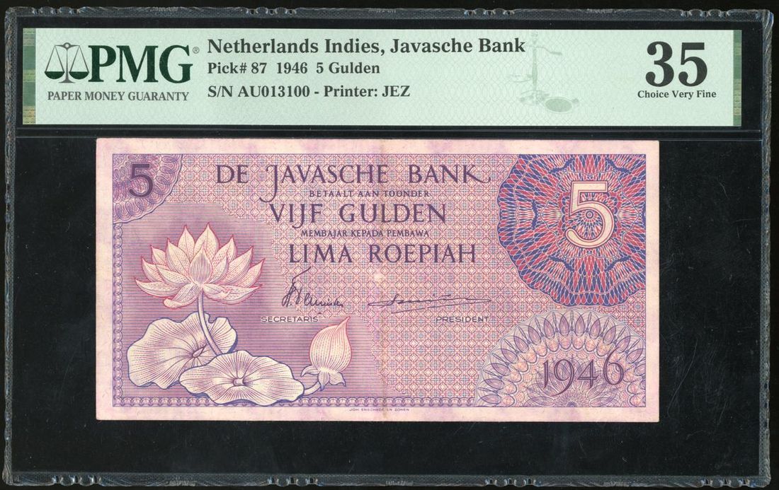 De Javasche Bank, Netherlands Indies, 5 gulden, 1946, serial number AU013100, (Pick 87), PMG 35