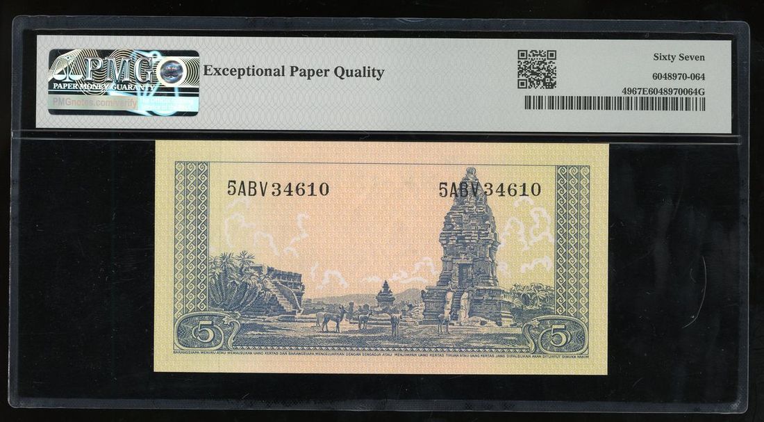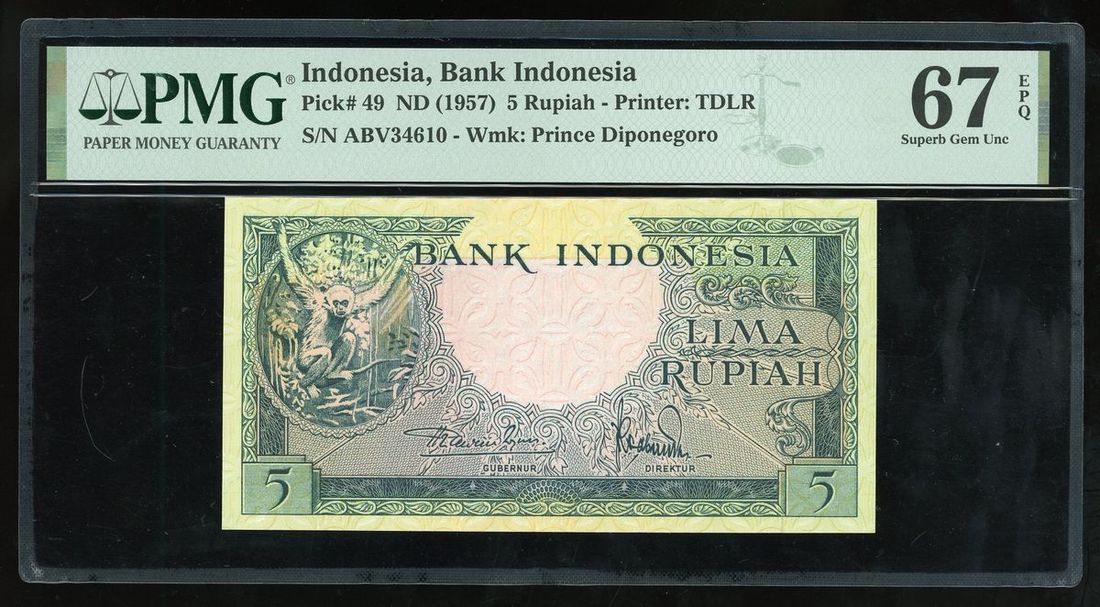 Bank Indonesia, 5 rupiah, ND (1957), serial number ABV34610, (Pick 49), PMG 67EPQ Superb Gem Uncirculated