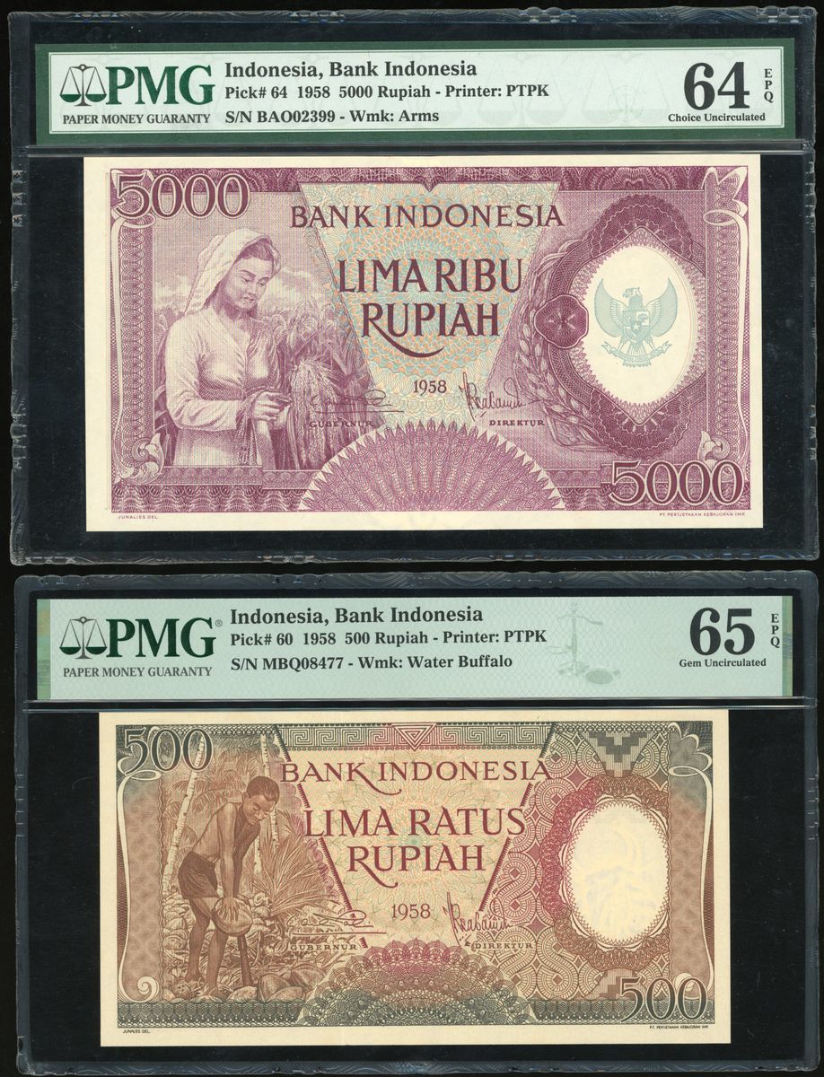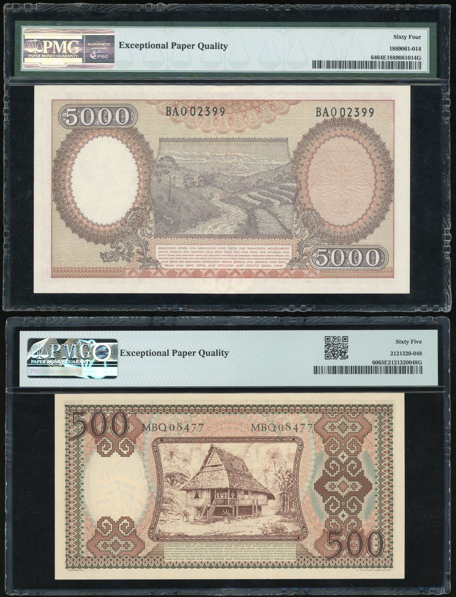 1958年印尼一組兩枚, 500及5000盾, 編號 MBQ08477及BAO0239. PMG 65EPQ, 64EPQ